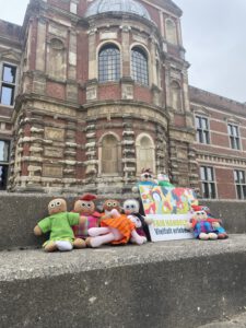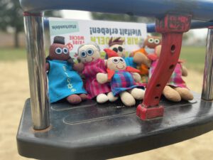 Dabei ritten die Puppen auf dem Rücken der bronzenen Gans am Schwanenteich und durften am Stück der Berliner Mauer Platz nehmen. Als nächstes ging es schaukeln auf dem Schlossplatz. Im Renaissance-Garten in der Zitadelle gab es einen echten Touri-Schnappschuss. Im Weltladen durften sie sich zwischen Kaffee und einem bunt dekorierten Auslagentisch ausbreiten. Anschließend kletterten einige von ihnen auf eine Tür am Hexenturm. Zurück im Büro gab es dann nochmal ein besonderes Highlight und sie konnten auf dem SDG-Glücksrad eine Runde Karussell fahren.