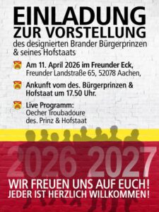 Am Samstag, den 11. April, steht im Freunder Eck in Aachen-Brand ein ganz besonderer Moment bevor: Die feierliche Vorstellung des designierten Brander Bürgerprinzen und seines Hofstaates.